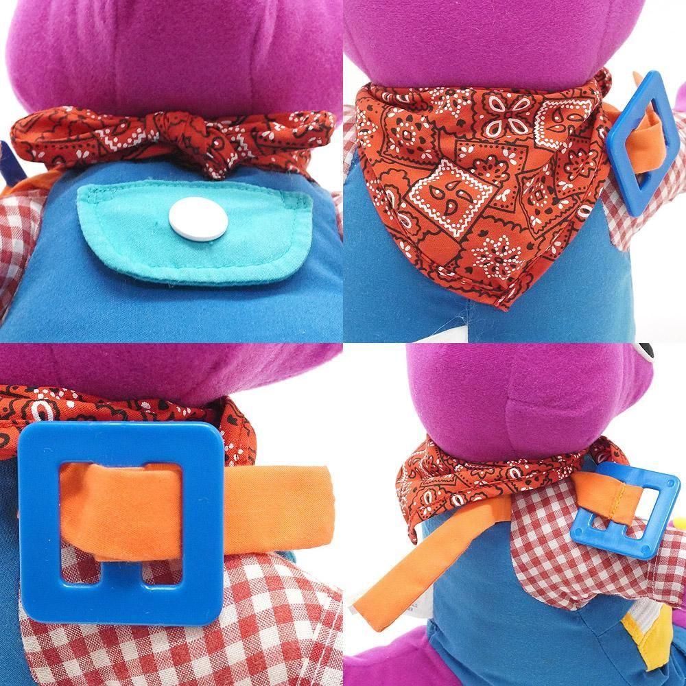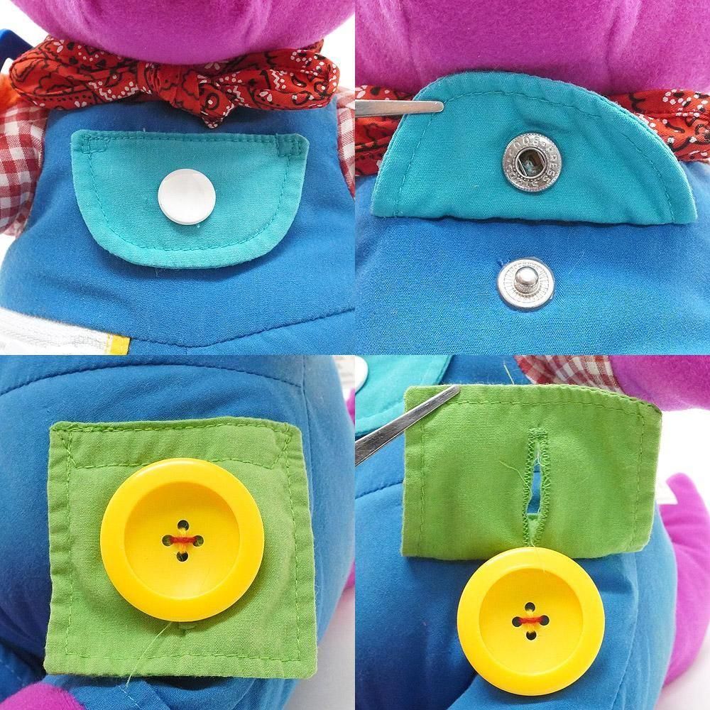 ボタン2種類、チャック、ベルトなど、遊びながら様々なトレーニングが出来るぬいぐるみです。