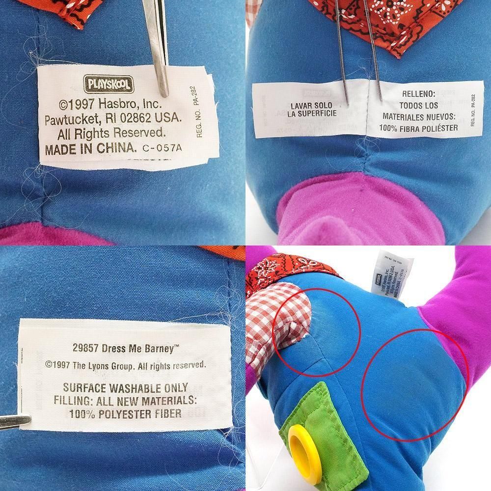 1997年にPLAYSKOOL (Hasbro)社から販売された、アメリカの子供向け番組「Barney&Friends」のメインキャラクター「Barney the Dinosaur」のぬいぐるみ「Dress Me Barney」です。