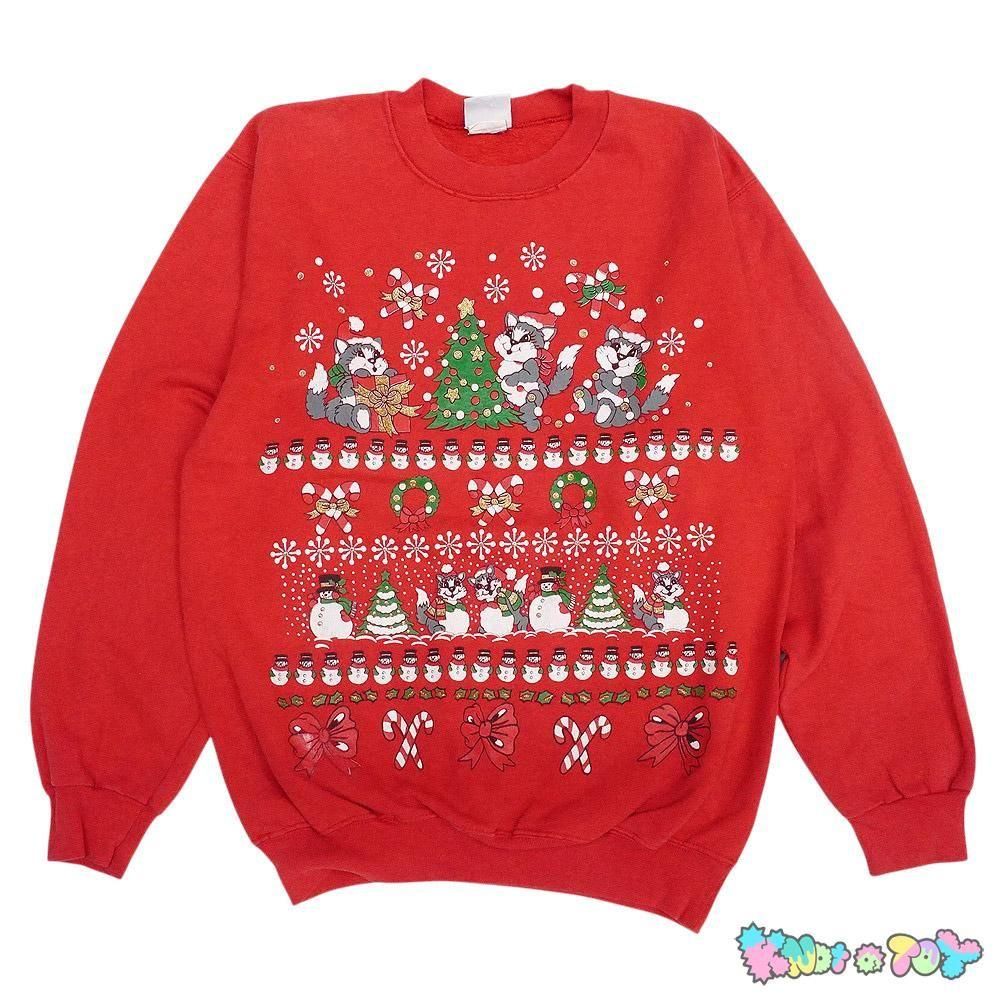 【商品名:Vintage Print Sweatshirt/ビンテージプリントスウェット/トレーナー・古着・レッド・Cristmas/クリスマス・ Kitty/キティ・Hanes Comfortblend】