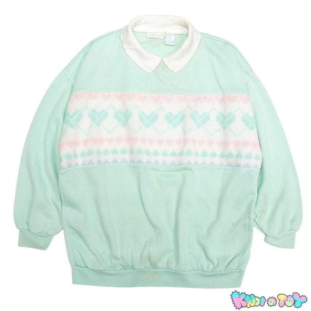 【商品名:Vintage Sweatshirt Knit/ビンテージスウェット/トレーナー・古着・パステルグリーン・ニット切り替え・Heart/ハート・LAUREN BROOKE】