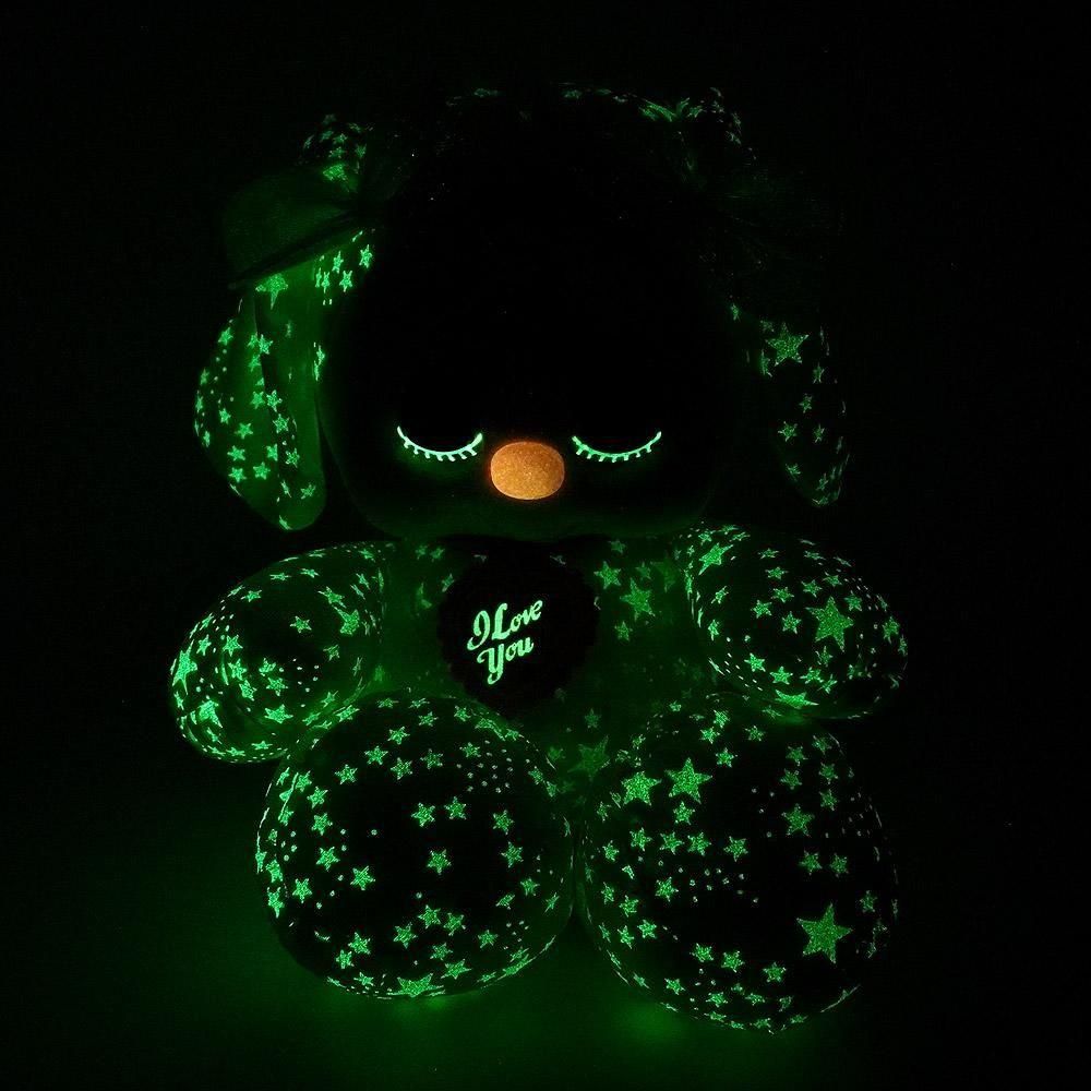 ボディの星柄や下まつ毛に蓄光素材が使用されているため、光を吸収した後、周辺を暗くするとその部分が蛍光イエローに光ります。