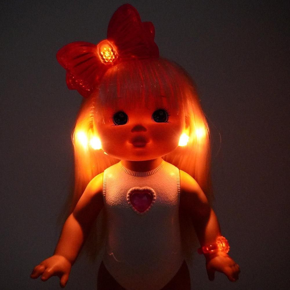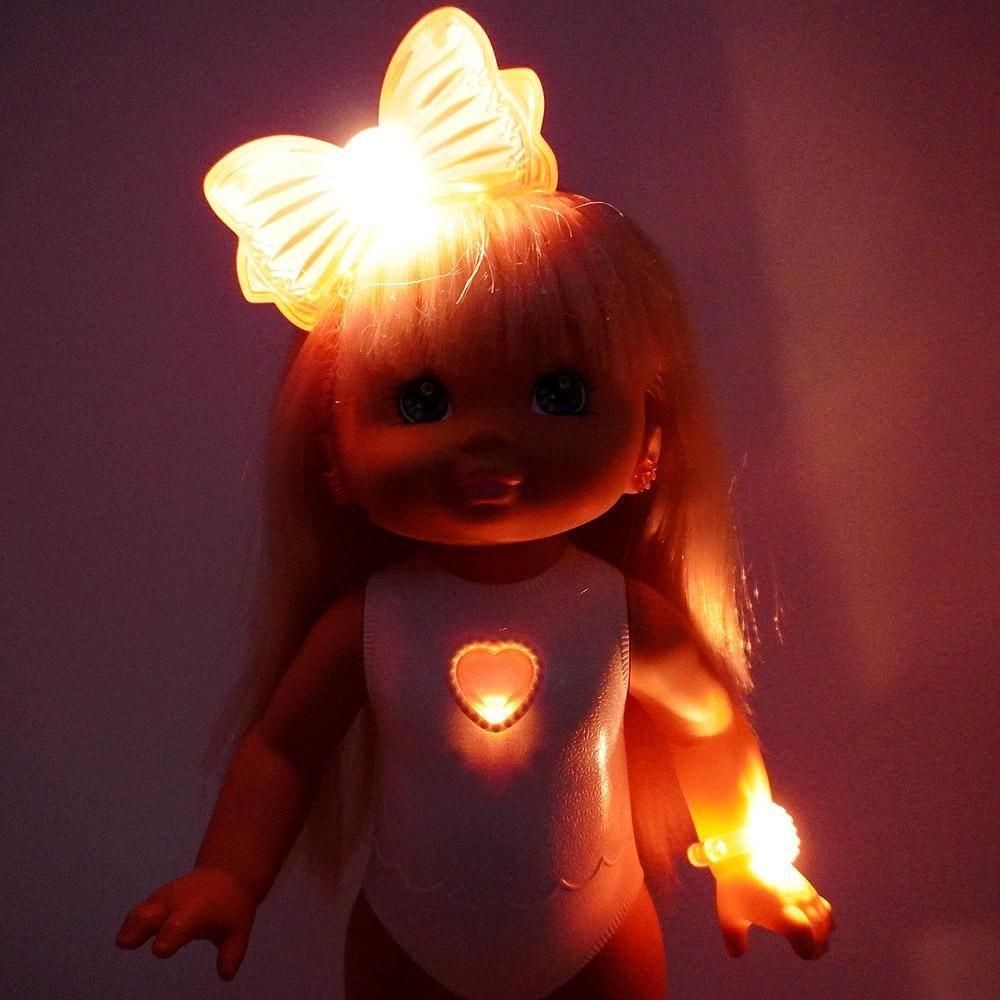 背中を押す(抱きしめる)と、胸のハート、リボン、ピアス、ブレスレットがライトアップします。
