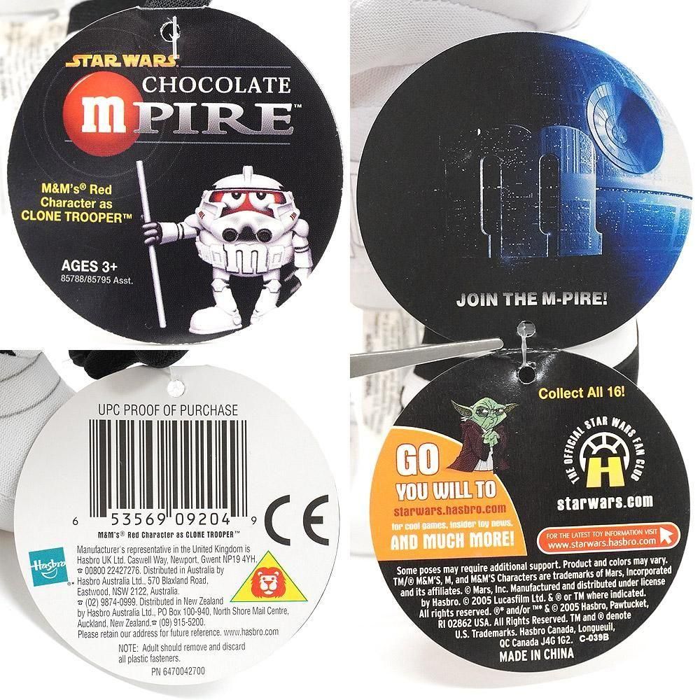 紙タグ・TM/ M&M'S, M, and M&M'S Characters are trademarks of Mars, Incorporated and its affiliates. Mars, Inc. Manufactured and distributed under license by Hasbro. 2005 Lucasfilm Ltd. & or TM where indicated. All rights reserved. * and/or TM & (C) 2005 Hasbro, Pawtucket, RI 02862 USA. All Rights Reserved. TM and denote U.S. Trademarks. Hasbro Canada,